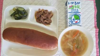 本日の献立は、豚肉のデミグラスソース、スープ、きゅうりのサラダ、黒糖パン、牛乳です。
