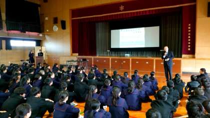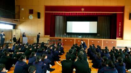 2年生の皆さんが、さまざまな企業の方に来ていただき「職業講話」の授業を受けています。5時間目は、ハローワーク大阪東の方から「職業選択について」、カトープレジャーグループの方々より「(企業が求める)中学生に身に付けて欲しい3つの事柄」を教わりました。
