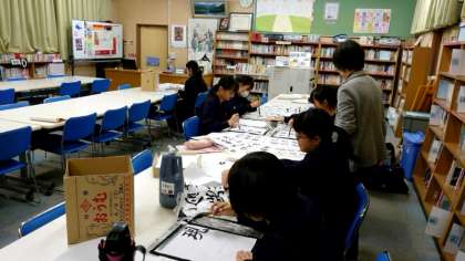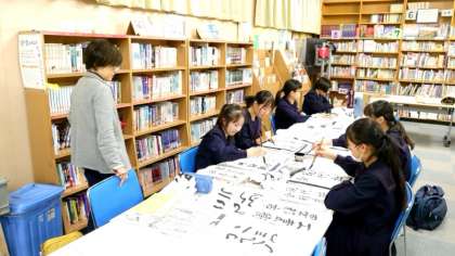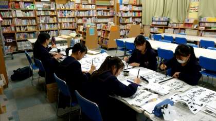 放課後の図書室で書道部の皆さんが練習に励んでいます。文化祭の作品展示が一段落し、現在は自身の腕を磨く時期。くり返し筆を運びながら、顧問の先生から出された課題をクリアしていきます。皆さん、時折おしゃべりを交えながら部活動を楽しんでいるようです。