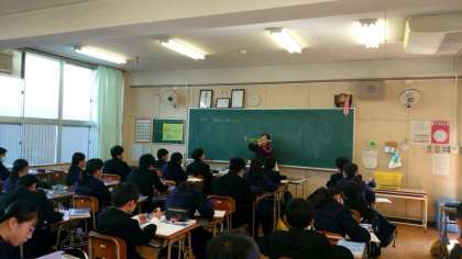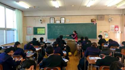 1年生数学科で図形の学習を行っています。今日は線分の中点(真ん中)の求め方を教わります。小学校では定規を使って長さ(cm・mm)を測って中点を求めていましたが、中学校ではコンパスを使って求めます。先生が1つ1つの作業手順をていねいに説明されています。皆さん、しっかり理解できましたか?