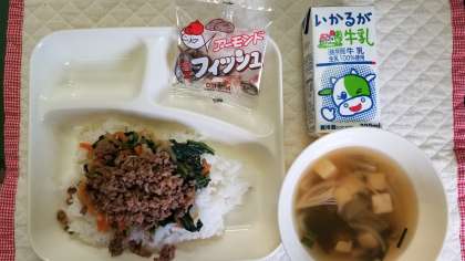 本日の献立は、ビビンバ、わかめスープ、アーモンドフィッシュ、牛乳です。