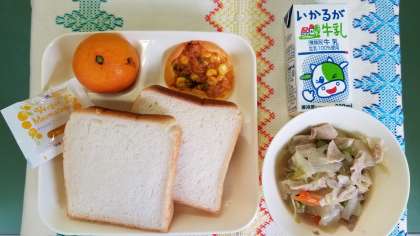 本日の献立は、豚肉とキャベツのスープ煮、変わりピザ、みかん、マーマレード、食パン、牛乳です。