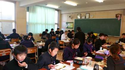 午前中の授業が終わり、皆さん楽しみの給食&昼休みです。今日は「中華」中心のメニュー。係生徒の皆さんがテキパキと食事の準備を整えます。みんなでおしゃべりしながら楽しく美味しくいただきましょう。(午後からの授業も頑張ってくださいね!)