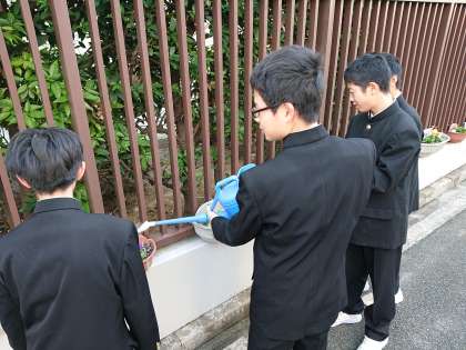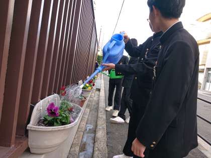 玄関前プランターの花の植え替えを生徒会が行いました。毎朝の「あいさつ運動」とあわせて、かかさず水やりもしてくれています。ピロティでは、おはようございますの元気な声が響いています。