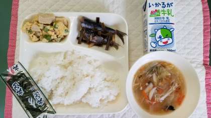 本日の献立は、いわしの生姜煮、うすくず汁、高野豆腐の卵とじ、焼き海苔、ごはん、牛乳です。