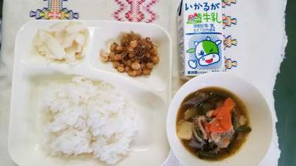 本日の献立は、鶏肉と野菜の煮物、じゃこ豆、かぶのゆず風味、ごはん、牛乳です。