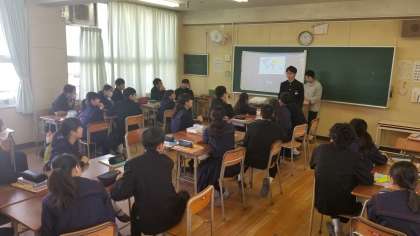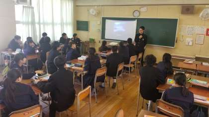 2年生の英語では、自分の後ろに映っているものを、みんなからの英語のヒントで当てるゲーム形式の授業から始まりました。