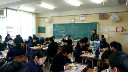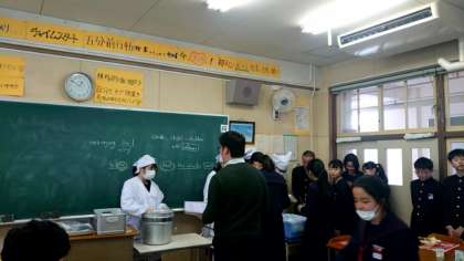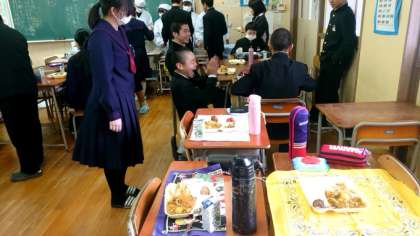 4時間目の授業が終わると、楽しみのお昼休み。今日のメニューは「ハンバーグカレー」です。2年生の教室では給食当番の皆さんが配膳に大忙し。カレーの大盛りやプチトマトの追加をリクエストする人もあり、わいわいと楽しく昼食準備をすすめていました。皆さん、美味しくいただけましたか?