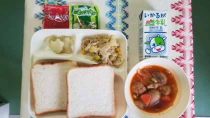 本日の献立は、ミートボールのケチャップ煮、ツナと野菜のソテー、焼きじゃが、抹茶大豆、食パン、いちごジャム、牛乳です。