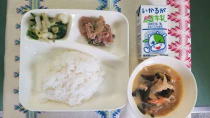 本日の献立は、豚肉のゴマだれ焼き、みそ汁、きくなと白菜のおひたし、ごはん、牛乳です。