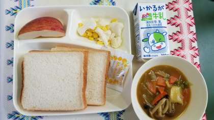本日の献立は、豚肉と野菜のカレー煮、カリフラワーとコーンのサラダ、りんご、マーマレード、食パン、牛乳です。