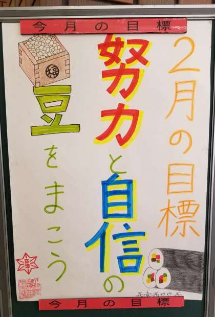 2月の学校目標は「努力と自信の豆をまこう!」です。
