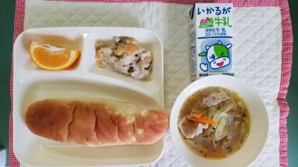 本日の献立は、押麦のグラタン、スープ、いよかん、おさつパン、牛乳です。