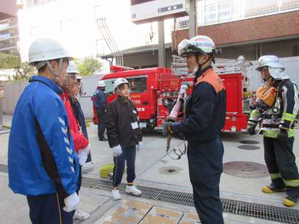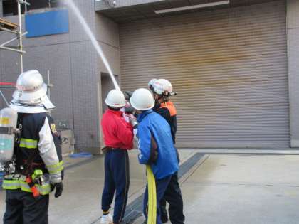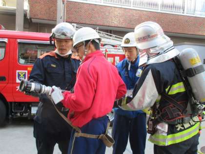 消防署で訓練の様子です。真剣に取り組んでいます。