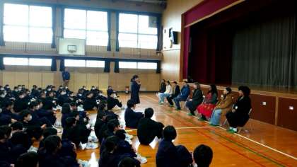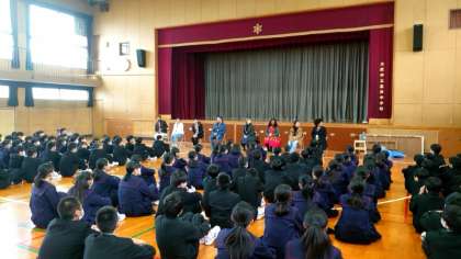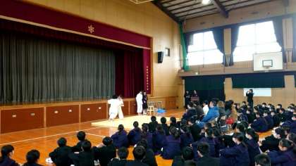 先週末、1年生で「国際交流学習」を行いました。大阪国際交流センター(日本語センター)より8名の留学生をお迎えしました。全体会では、1年生の皆さんが日本の伝統文化を紹介します。目の前で繰り広げられるパフォーマンスに、留学生の皆さんも興味深く鑑賞されていました。