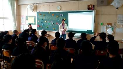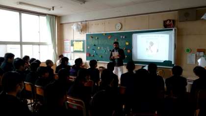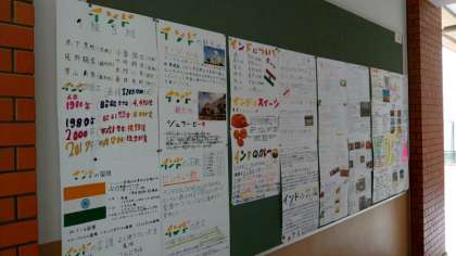 全体会の後、各クラスに分かれて交流を図ります。1組ではインドとミャンマーのお二人から、各国の特色を教わりました。歴史的建造物や食べ物、有名人など、時折クイズを交えながら、楽しいひと時を過ごしました。