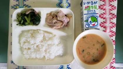 本日の献立は、鶏肉の柚子塩焼き、さつま芋のみそ汁、小松菜の煮びたし、牛乳です。