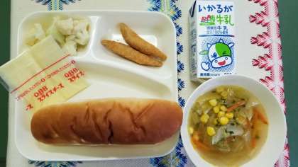 本日の献立は、わかさぎフライ、はくさいのスープ、カリフラワーのサラダ、スライスチーズ、おさつパン、牛乳です。