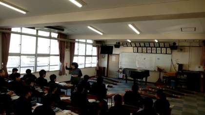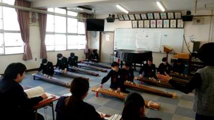 1年生音楽科で「筝(そう)」の演奏を教わっています。音楽室に10張の筝が用意され、「さくらさくら」を演奏します。皆さんが良く知っている日本の伝統的な楽曲なので、案外スムーズに演奏できるようです。筝の美しくやわらかな音色が音楽室に響いていました。