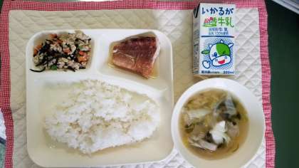 本日の献立は、あかうおのしょう油だれかけ、うすくず汁、高野豆腐のいり煮、ごはん、牛乳です。