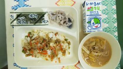 本日の献立は、鶏ごぼう飯、みそ汁、焼きれんこん、焼きのり、牛乳です。