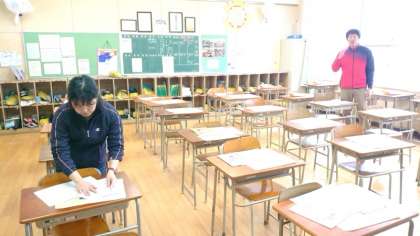 (上から)1年生は各教室でプリントの袋詰め作業中