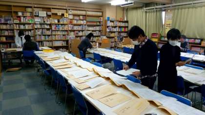 先週実施された1,2年学年末テスト。全教科採点が済み、先生方がテスト返却の準備を行っています。封筒に、テストの解答用紙や模範解答、休業中の連絡事項などを詰めていきます。今日から3日間、ご家庭を訪問させていただく予定です。保護者の皆様のご理解をお願いいたします。(お子さまの健康状態やテスト返却が主な目的ですので、保護者の皆様がお家におられなくても結構です)