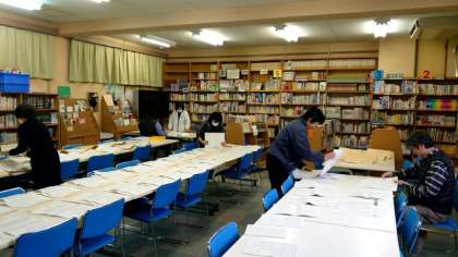 2年生は図書室に集まって、一斉に袋詰め