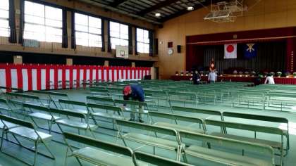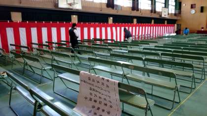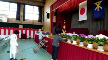 式次第(拡大)も用意され、前面の壁に貼るのを待つばかり。式場準備も大詰めを迎えました。明日も良い天気が期待できそう。卒業生の皆さんにとって良い思い出の一日になりますように!