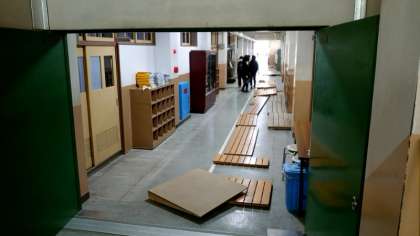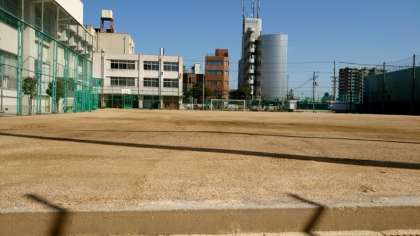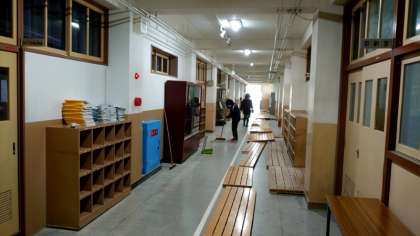 職員室前に続いて、図書室前の廊下を清掃します。登下校時や職員室に行くときなど、生徒の皆さんがよく使う、高津中のメイン通りです。スノコをあげて綿ぼこりを集め、モップをかけて仕上げます。おかげさまで廊下もピカピカになりました。