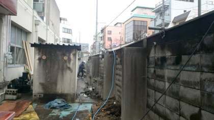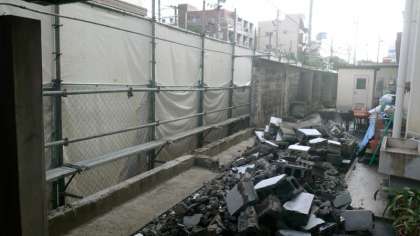 学校北側のブロック塀を鉄柵に取り換える工事が進んでいます。現在、ブロック塀を取り壊す作業の真っ最中。作業員の方が塀を斫(はつ)り、瞬く間にブロック塀が無くなっていきます。