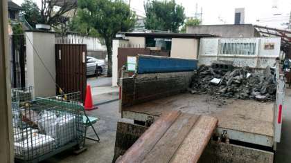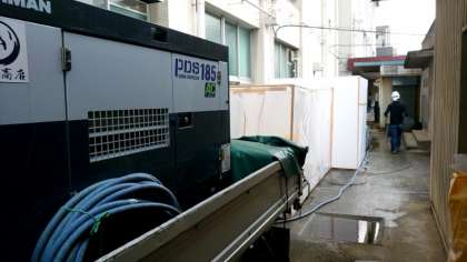 今朝は時折冷たい雨が降る中、作業員さんが懸命に作業されています。圧縮した空気の力を利用してブロックを破壊する「エアハンマー」を使っておられるとのこと。大変な作業かと思います。作業員の皆さん、ありがとうございます!