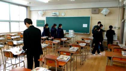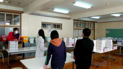 新入生の皆さんに配付する教科書を準備しています。教科ごとに仕分けし、各教室の机に置いていきました。明日の入学式後、新入生の皆さんに持って帰っていただきます。制カバンなど、大きめのバッグをご用意ください。