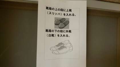 1年生の教室前に、靴箱利用の注意事項が掲示されています。高津中では教室内は「上履き」、廊下や運動場などは「運動靴」の2足制。また2段に分かれた靴箱の上段に上履き、下段に運動靴を収納します。新入生の皆さん、間違えないように気をつけてくださいね。
