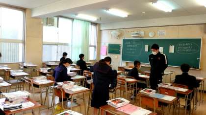 本日は教科書配布の最終日。午前中は1・2年生、午後は3年生が登校します。今朝は1年生の皆さんがやってきます。出席番号の奇数・偶数に分かれ、時間帯をずらしての登校です。皆さん時間を守ってきてくれました。