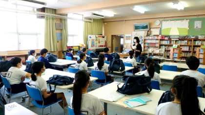 3組の皆さんは2階の教室(AL教室・図書室)で学活です。先生からマスクや図書カードを受け取ります。下校途中に失ったりしないよう、しっかりカバンにしまってくださいね。