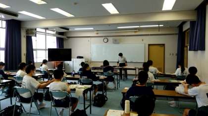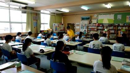 4組の皆さんが学級活動中。先生から布製マスクを受け取り、不具合が無いか確かめます。皆さん対策を十分講じていると思いますが、感染予防にむけて大切に使ってくださいね。