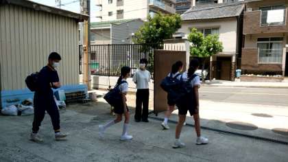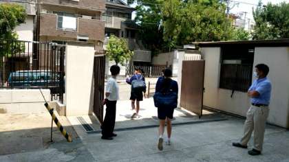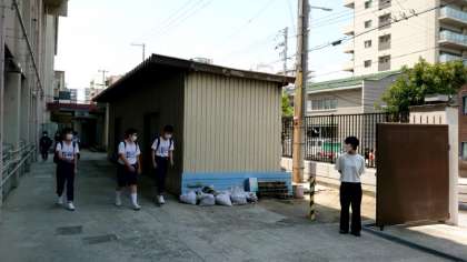 学級活動を終えた2年2,4組の皆さんが下校しています。生徒の動きができるだけ一方通行になるよう、登校時の正門玄関とは違って校舎北門から帰ります。わずかな時間でしたが、皆さん元気で何よりです。また来週、楽しみに待っています!