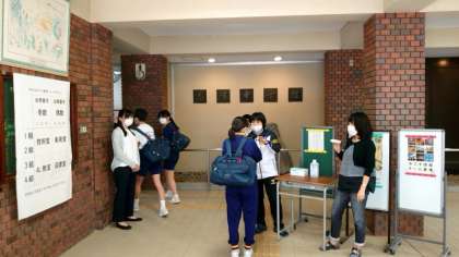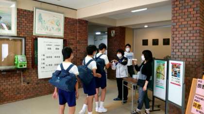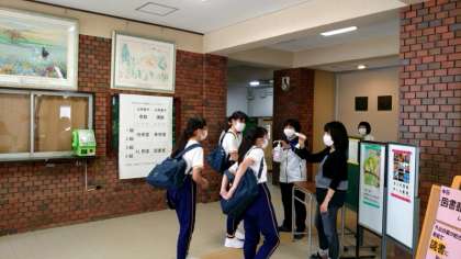 本日の午後は3年の登校日。お昼過ぎから、学校にやってきました。玄関ピロティで先生方が3年生を迎えます。「体調はどうですか?お熱測ってきましたか?」と一人一人に声をかけます。マスク越しの表情ですが、皆さん元気そうで良かったです。
