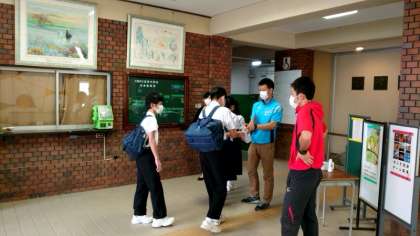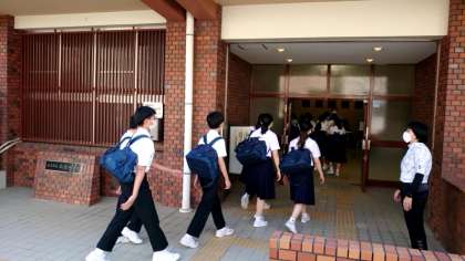 3年の学習登校最終日。今日も午前中3時間の授業にのぞみます。朝から美しい青空が広がる中、3年生の皆さんが登校します。マスクを着用していますが、元気にあいさつを交わしながら校門をくぐります。今日も頑張りましょう!