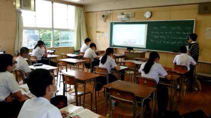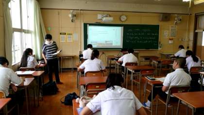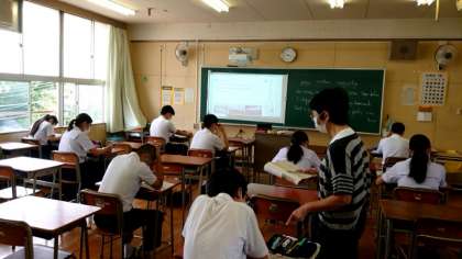 3年生の皆さんが英語の学習中。教科書の新出単語を教わります。全員が大きな声で発音練習するところですが、今は小声で練習します。発音記号の違いに気をつけて、特徴をおさえてくださいね。