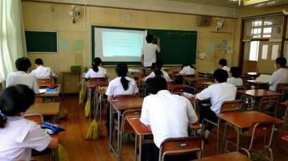 2年生英語科で英作文を学習中。例題(英文の過去形)を使ってさまざまな疑問文を作っていきます。場所を尋ねたり(Where)、日時を尋ねたり(When)、いろんな英文にチャレンジします。疑問文へと変換するルールを覚えればできるハズ。多くの例題に取り組み、ぜひマスターしてくださいね。