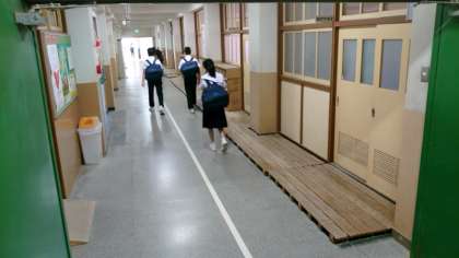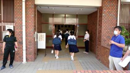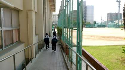 今朝も快晴の中、生徒の皆さんが登校します。皆さん、正門玄関から入るのですが、しばらくの間は教室にむかうルートを学年別に分けています。登校時に廊下等の混雑を避けるための措置なので、協力してくださいね。