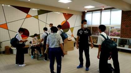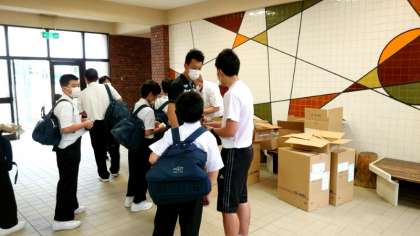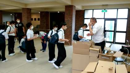 今日と明後日、玄関ピロティで水泳の授業で着用する水着類の販売を行っています。学級活動を終えた1年生が列をつくります。今日は男子対象、明後日は女子対象に分けて販売しています。水泳の授業は7月以降スタートする予定です。気持ちよく泳いでくださいね!