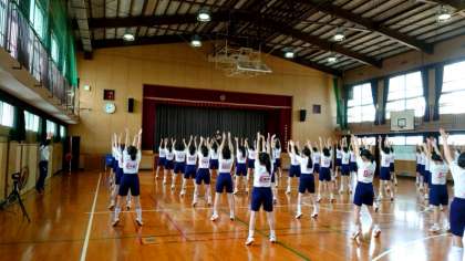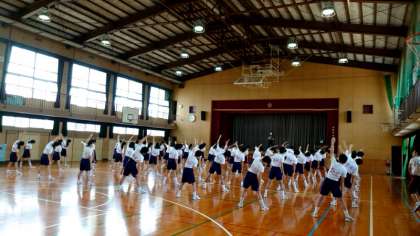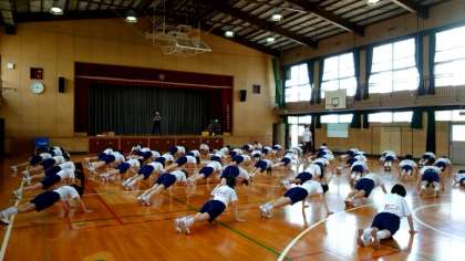 3年生体育の授業も全員が揃いました。授業の最初はラジオ体操&補強運動から。体育委員さんの号令にあわせて、みんなで身体をほぐします。最初から無理しないよう、身体を徐々に慣らしてくださいね。