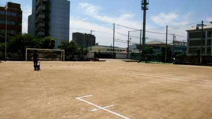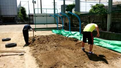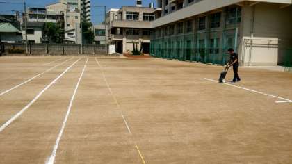 体育科の先生方が授業の準備を行っています。今までは体育館内で授業を行っていましたが、今日から「50m走」「走り幅跳び」など陸上競技に取り組みます。生シャベルを使って砂場の砂を掘り起こしフワフワに仕上げます(けっこう重労働)。生徒の皆さん、元気よく跳んでくださいね。