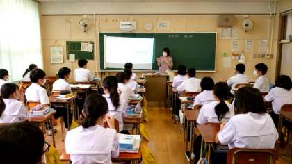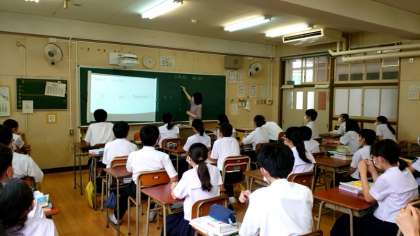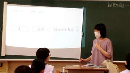 1年生英語科で「be動詞」を教わります。「I am 〇〇.(私は〇〇です)」や「You are〇〇.(あなたは〇〇です)」の「です」にあてはまるのが be動詞。英文の学習で最初に登場する動詞です。黒板に投影された例文を見ながら、くり返し練習しましょう。