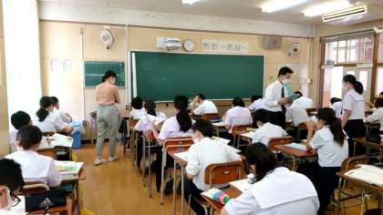 1年生国語科で「詩」を鑑賞中。今日の作品は、詩人・谷川俊太郎氏の「朝のリレー」。今日は国語の先生2名で授業をすすめます。詩を暗唱する人、ワーク(問題集)に取り組む人それぞれに先生が付き添って指導します。わからない点があればどんどん質問してくださいね。