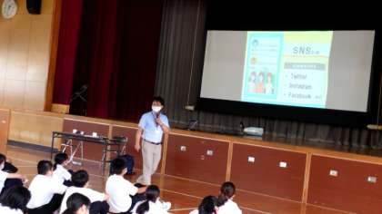 2年生対象の「スマホ・携帯安全教室」を開講中。今回は、SNSで自身の肖像や自宅付近の光景をアップしたために不審者から狙われるドラマを視聴しました。SNSによる被害やトラブルについて知り、安全な使い方を身に付けてくださいね。