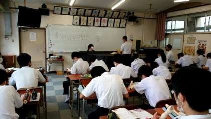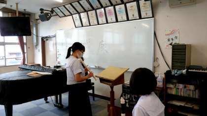 3年生音楽の授業でリコーダーの運指を確認中。先生が弾くピアノの音にあわせて、同じ音をリコーダー(笛)で示します。(感染防止のため)実際に吹くことはかないませんが、指の動き(運指)を確かめました。皆さん、上手に押さえられていましたね。